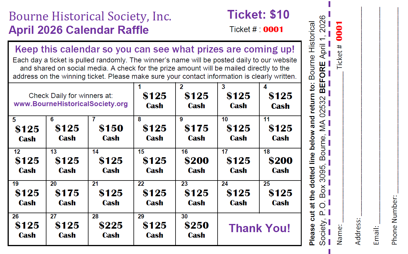 Your participation in this important fundraiser helps us preserve and share Bourne’s unique history. Thank you for your support—and good luck!Stay tuned for daily winners, updates, and more ways to get involved throughout the season!We’re getting ready to kick off the 2026 BHS April Calendar Raffle and there’s still time to purchase your tickets!
